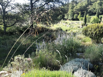 Basse siepi di alloro, quercia, oleandro e rosmarino sono potate per formare linee orizzontali e tra queste prosperano ulivi, viti e alberi da frutto. Arbusti fioriti - salvia, nepeta, rosmarino, agapanto, cosmos – nei toni del blu, dell'arancio e del bianco forniscono accenti di colore.