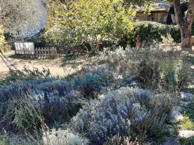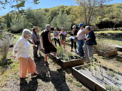 C'è un giardino dimostrativo che espone un gran numero di specie, con l'obiettivo di creare una comunità ricca di biodiversità. È curato secondo principi ecologici e le piante non vengono annaffiate una volta attecchite. Sebbene la nostra visita si sia svolta in ottobre, dopo la solita estate secca, il giardino è rimasto interessante e attraente. Un'ampia varietà di Artemisia, Euphorbia, Elicriso e Santolina viene coltivata insieme a Cisto, Rosmarino, Teucrium e Phlomis, oltre a diverse piante meno note e resistenti alla siccità.