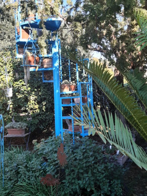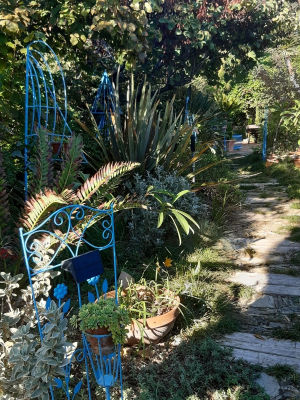 C'è una grande varietà di piante ben attecchite e insolite, tra cui sono stati inseriti diversi oggetti "trovati", tutti dipinti di un azzurro che richiama il mare. Questo è stato sorprendentemente efficace nel dare coesione al giardino.