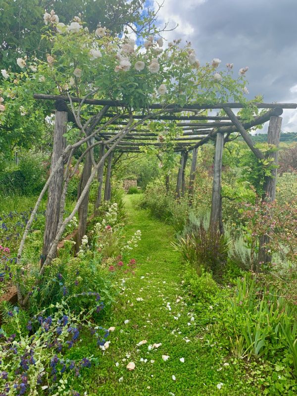 Abbiamo passeggiato nel giardino con Jane e poi abbiamo fatto un rinfresco sotto il pergolato, condividendo problemi, curiosità sulle piante, progetti per il giardino e gli attrezzi da giardino preferiti. Torre Di Sopra è disponibile per affitti turistici.