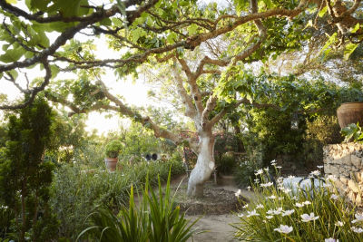 Basse siepi di alloro, quercia, oleandro e rosmarino sono potate per formare linee orizzontali e tra queste prosperano ulivi, viti e alberi da frutto. Arbusti fioriti - salvia, nepeta, rosmarino, agapanto, cosmos – nei toni del blu, dell'arancio e del bianco forniscono accenti di colore.