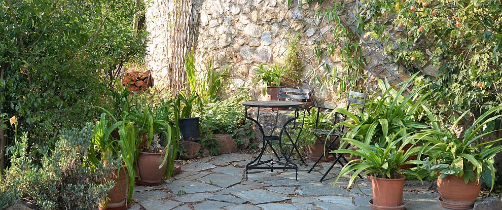 Un laghetto naturale con ninfee circondato da terrazze ricoperte di flora mediterranea. La proprietaria, che ama le rose, sostiene siano facili da coltivare e compatibili in un giardino mediterraneo. Ha creato un grande “dell” o “conca” mettendo a dimora numerosissime varietà di antiche rose privilegiando chinensis, tèa e noisette. Lo schema dell’ impianto è stato progettato per non avere bisogno di irrigazione dopo il primo anno.